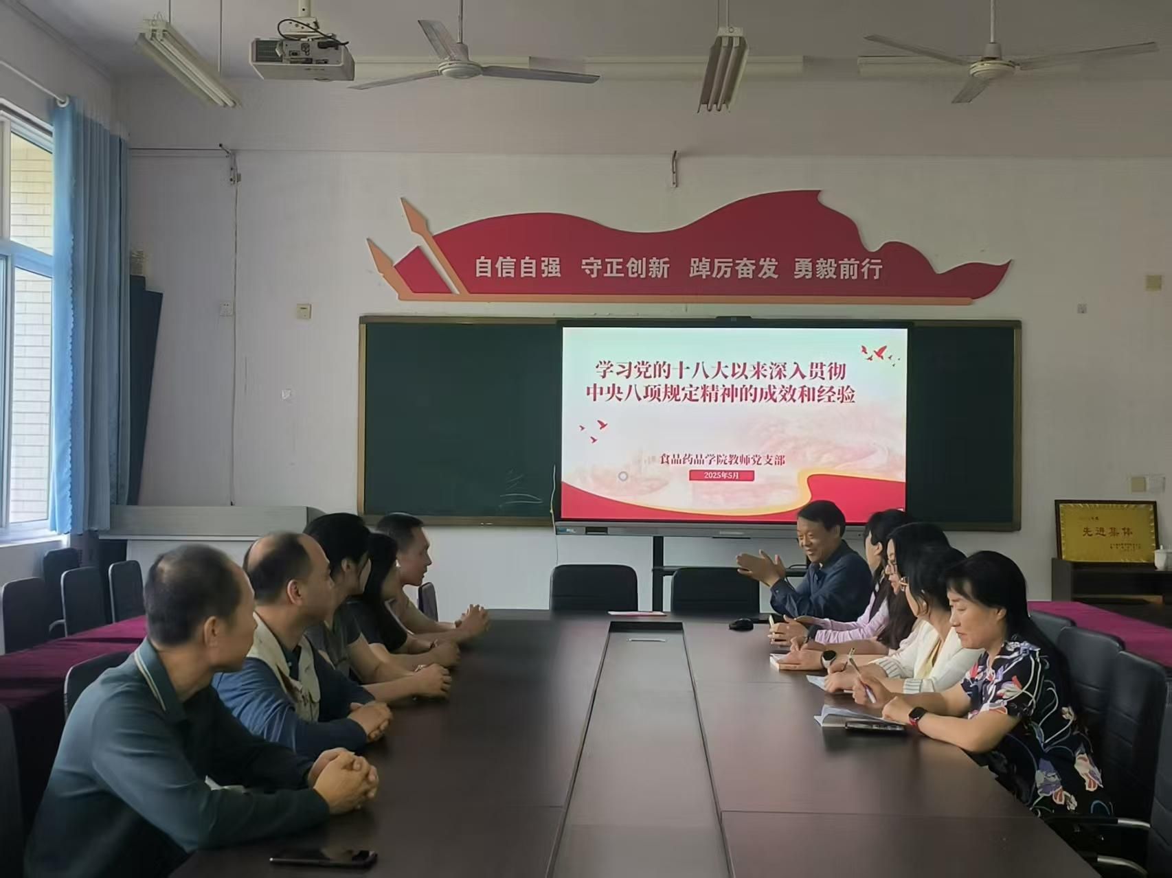 2025年5月19日,食品药品学院教师党支部在惠泽1号楼103会议室召开了5月份主题党日暨党员大会,会议由食品药品学院教师党支部负责同志主持并主讲,全体党员参加。