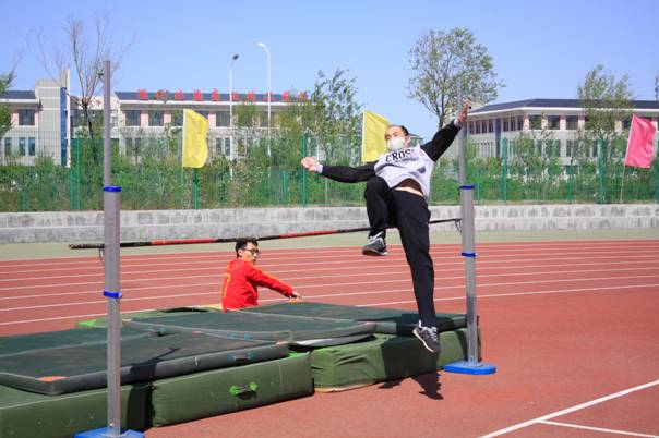 再看看操场那边的郝会军老师,他参加的是跳高比赛,获得了第二名的优异成绩。他一边活动腿脚,一边扭腰,一边望着前边的横竿,接着双腿前后叉开微屈,身体前倾,深深地吸了一口气,然后撩开大步,噌噌噌,一阵风似的冲向横竿用力起跳,双臂向上前伸,身体跃起腾空随即呈仰卧式,恰似轻捷的春燕,唰的一下顺利掠过横竿。太棒了!