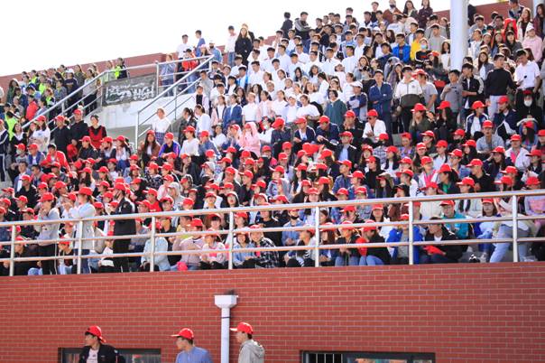 有的系有节奏的敲着鼓呐喊“加油!加油!”,有的系吹着号角同样大喊着“加油!加油!”,还有的拿着喇叭,扯着嗓子大喊“食药,加油!”“食药,加油!”他们顶着烈阳,任汗水从头顶一直流到脖子,滴落在衣服上,浸湿了领子,打湿了后背。数小时顾不上喝一口水,铿锵有力,声嘶力竭,大声疾呼着为自己所在的系呐喊、助威。每当一项比赛中有食药的同学时,他们有的瞪大了双眼,有的伸长了脖子,有的张大了嘴巴,就像生怕少了自己的一份呐喊,运动员就拿不到好成绩。