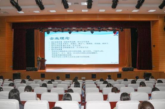 食品药品学院主要负责同志代表学院对山东新和盛农牧集团领导一行的到来表示热烈的欢迎,全场师生一同观看了新和盛农牧集团的企业宣传片。随后,公司食品技术总监孙丽花从新和盛集团对国际连锁餐饮品牌和本土连锁餐饮品牌的产品供应两个方面介绍了新和盛的三大类产品;品控总监卢永盛介绍了企业愿景、核心文化、经营理念、传播理念、经营原则等方面的内容。接下来,公司总裁温海涛以“面对未来三十年的职场生涯,你准备了些什么”为题,为全场师生作了一场精彩的报告。温海涛从新和盛的企业文化、大学生的职业规划和人才培养等几个方面入手,结合个人的经历和新和盛集团的发展历程,为同学们讲解了新和盛的管理团队、核心竞争力、发展机遇和未来规划,使同学们深入了解了行业发展趋势和人才发展需求,为同学们日后的择业、就业提供了指导与帮助,现场气氛十分活跃。最后,我院在新和盛集团就职的毕业生与即将踏入顶岗实习岗位的在校生进行了经验分享和交流。