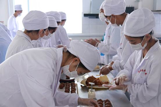 本次实训活动,在食品药品学院食品技术教研室老师们的精心组织和耐心指导下,打破了原有的班级限制,将各专业学生分为调馅、和面、成型,烘烤、包装,销售等六个生产工作小组,轮岗循环。学生从开始的手法生疏、次品多到手法娴熟、零次品,经过严格的过程性技能考核,最终制作出的月饼品相金黄饱满、口感软糯细腻,得到全院师生的一致好评。在实训的过程中,指导教师与学生一起切磋技艺,感受着中国传统节日文化的魅力,同时严把原料质量安全关,增强学生食品生产的质量意识、安全意识和服务意识,确保生产出的产品让师生吃的满意、吃的放心。