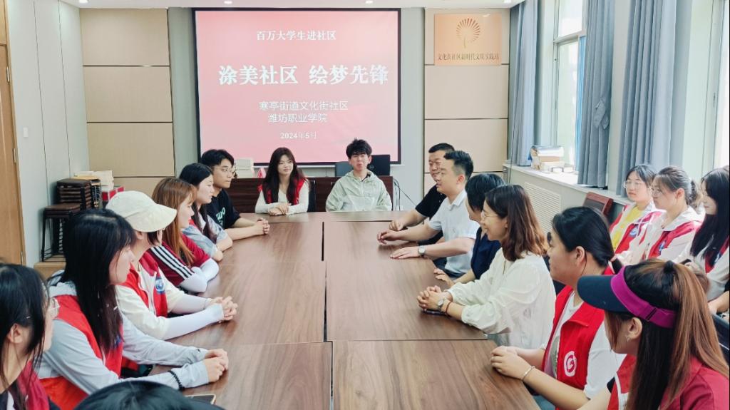 根据团省委《2024 年山东省“百万大学生进社区“社会实践工作指引》要求,,整合共青团组织优势、协调优势、队伍优势,全面推进“百万大学生进社区”社会实践工作,食品药品学院、信息工程学院于4月8日与寒亭区文化街社区完成了揭榜挂帅对接,于5月18-5月19日赴寒亭区文化街社区开展“涂美社区·绘梦先锋”社会实践活动。