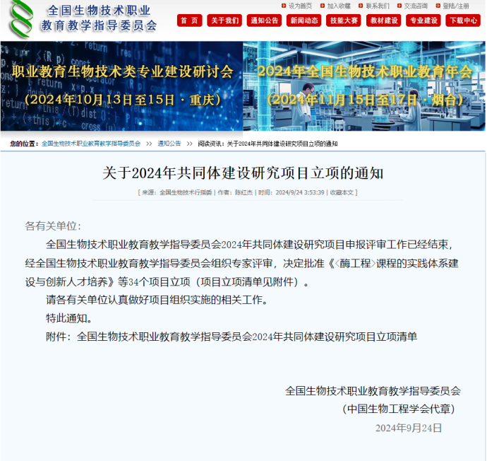 近日,全国生物技术职业教育教学指导委员会公布了2024年共同体建设研究项目立项名单,来自16家企业、院校的34个项目获批立项。其中,我院获批7个项目,数量位居所有单位首位,食品药品学院的郭建慧、郝会军等教师团队的项目榜上有名。