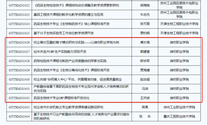全国生物技术职业教育教学指导委员会是全国生物技术行业产教融合共同体的指导单位,我院为共同体副理事长单位。本次研究项目围绕构建产教供需对接机制、联合开展人才培养、协同开展技术攻关、开发教学资源、制定专项政策等五个层面开展。为加强共同体建设,我院教师团队分别从培训项目开发与实施、专业核心课程标准开发、实践能力项目开发等具体方面申报立项,旨在为共同体“五金”建设贡献潍职力量。