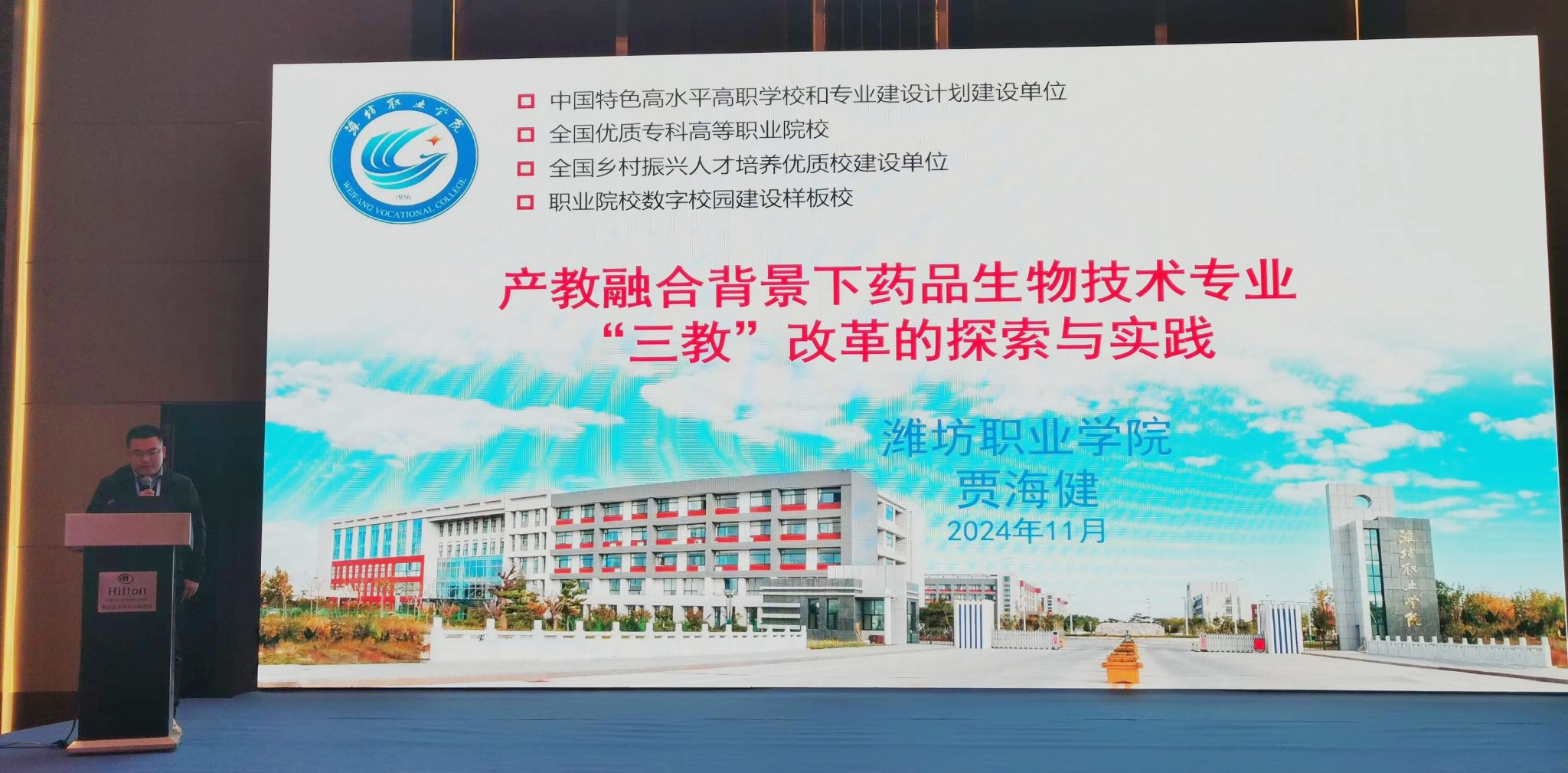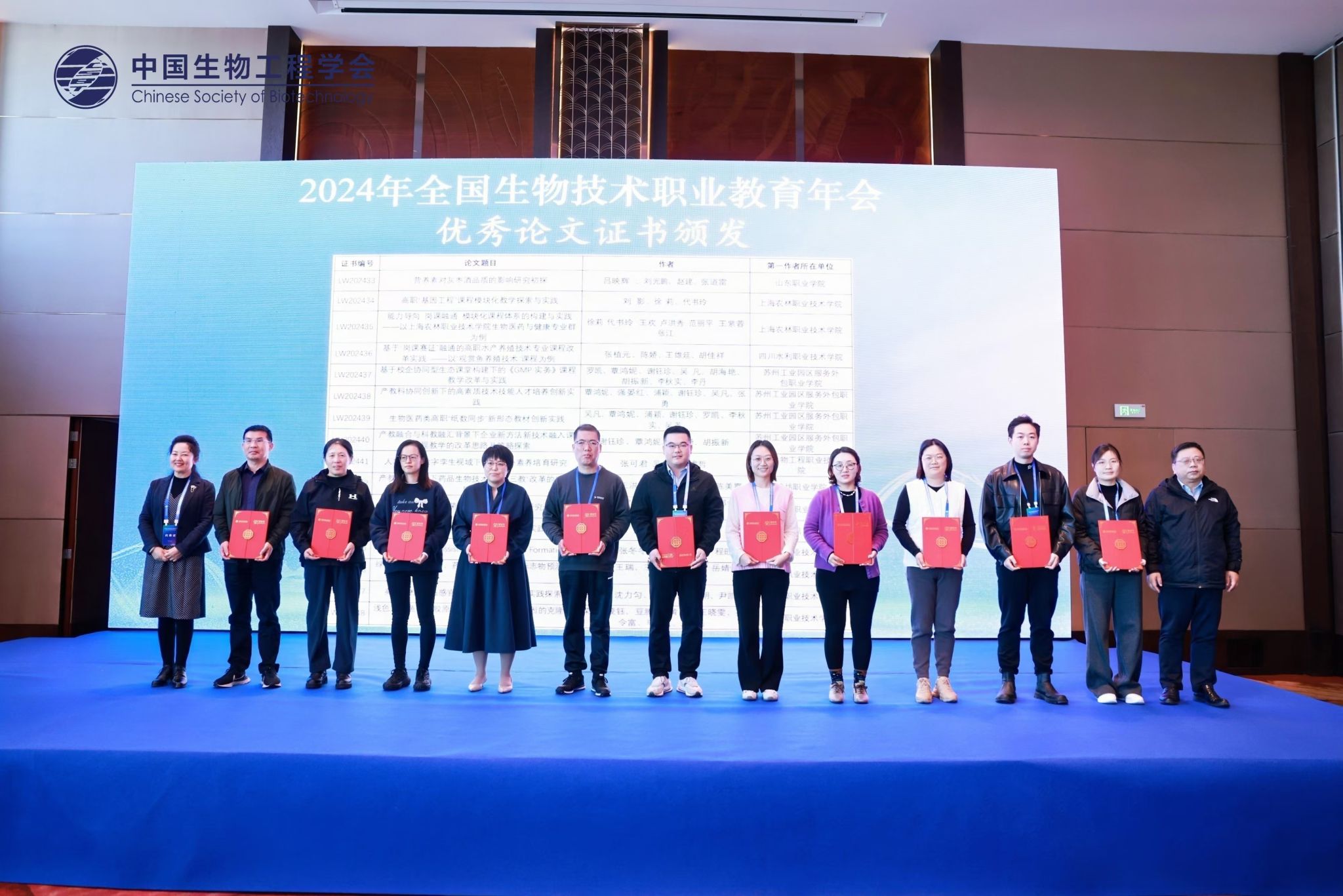 在随后召开的全国生物技术职业教育年会上,食品药品学院贾海健老师以《产教融合背景下药品生物技术专业“三教”改革的探索与实践》为题作典型发言,受到与会全国职业院校生物技术领域专家同行一致好评。会上还为2023年结题教改项目、2024年立项教改项目和年会优秀论文颁发证书,学院共有8个项目入选。