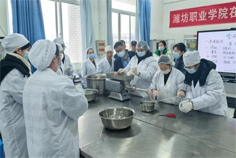 韩瑞东一行听取了食品药品学院关于香肠加工等实训项目在岗位架构、产品创新、原料筛选、品质把控以及师生组织等方面的详细汇报,实地观摩了面点烘焙以及香肠加工从原料预处理、调配腌制到灌装排气的工艺流程,并对此次实训项目给予高度认可。韩瑞东指出,教学实训在培养高素质技术技能人才中起着至关重要的作用,二级学院应紧密结合专业实际,创新教学模式,以前瞻性的视角规划实训项目;要增强安全意识,坚守质量标准,并加强进度管理;要结合行业产业发展趋势,精准匹配企业需求,通过引进企业技术、项目、标准等,探索多元化的校企合作模式,在企业需求与学院教学体系深度融合中努力实现教学成果的落地转化。