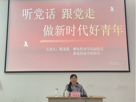 为进一步提升学生政治思想觉悟,坚定理想信念,助力学生成长成才,4月15日下午学院副院长陈美霞到绿竹社区开展“听党话,跟党走,做新时代好青年”思想政治专题报告,食品药品学院辅导员、学生会成员、入党积极分子共同聆听了报告。