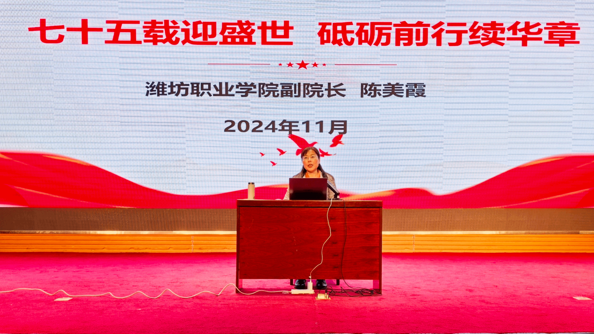 本次思政课包括七十五载中华盛世、六十八年潍职发展、新时代青年风采等三个版块。陈美霞从新中国成立以来辉煌成就出发,讲解了我国在经济、政治、文化、社会、生态五大领域所取得的历史性突破,生动展现了一幅国家繁荣昌盛的壮丽画卷;回顾了潍坊职业学院六十八年的风雨历程,从学院的初创与发展,到如今的成就与影响力,每一个阶段都凝聚着无数前辈的心血与智慧;列举了学院优秀毕业生的典型事例,展示潍职学子的卓越风采与精神风貌,引起了学生们的强烈共鸣。她最后激励同学们,要在强国建设、民族复兴的伟大事业中积极作为,以青春之姿书写时代华章,贡献青春力量。