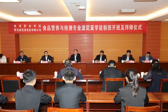 4月15日,潍坊职业学院与青岛波尼亚食品有限公司校企合作项目食品营养与检测专业波尼亚学徒制班签约及拜师仪式于滨海校区清泽楼312举行。学院副院长李瑞昌、青岛波尼亚食品有限公司运营副总经理段中航出席仪式,教务处、科技处相关同志、波尼亚公司项目负责人、食品药品学院党总支书记、教师代表和学徒制班全体师徒参加了仪式。