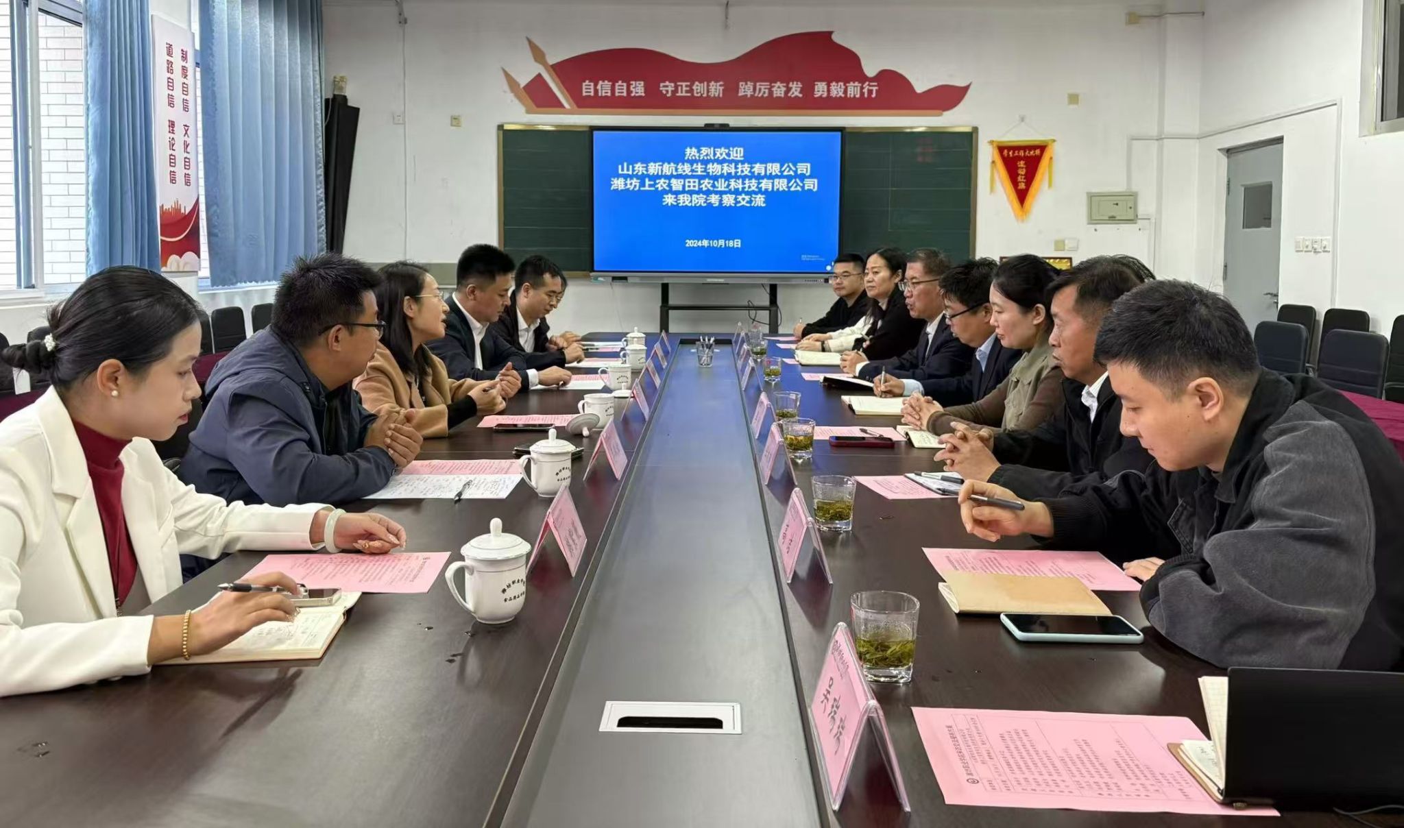 为落实协同育人,推动产学研深度融合,10月18日上午,共青团潍城区委书记韩泽宇带领山东新航线生物科技有限公司、潍坊上农智田农业科技有限公司一行6人到食品药品学院交流座谈,并签订校企合作协议。团委学生工作处负责同志,食品药品学院、农林科技学院党政负责同志,分管校企合作负责人及相关教师参加了会议。