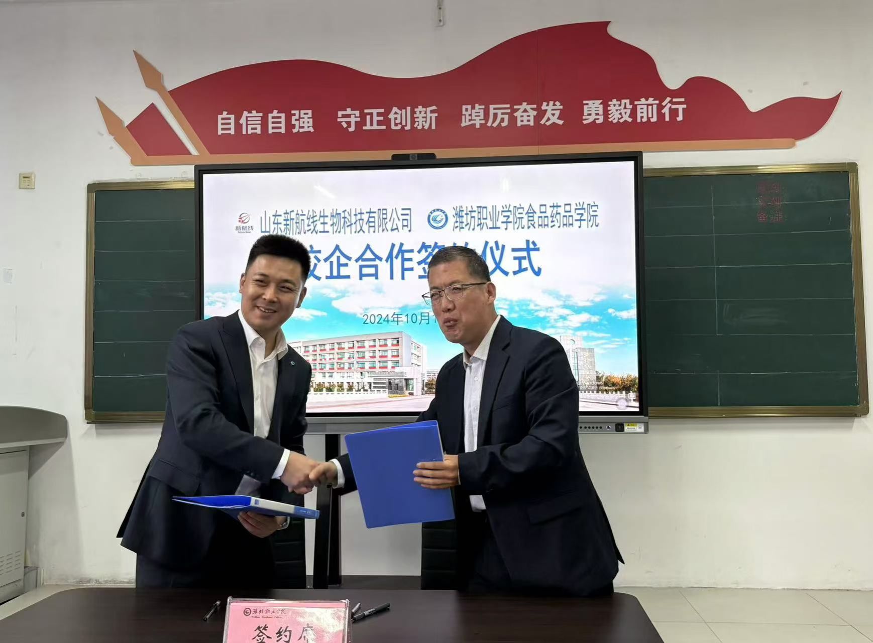 团委学生工作处负责同志对来访人员表示热烈欢迎,介绍了学院的基本情况,希望校企双方在人才引育、科技研发等方面加强合作,共促发展。韩泽宇表示,希望通过此次交流,校企双方能够深化合作,培养适应企业需求的高技能人才,留住更多优秀毕业生,为潍城区域企业和经济建设贡献力量。双方观看了学院宣传片,食品药品学院与农林科技学院主要负责同志分别介绍了学院的师资队伍、办学规模、专业设置等情况,重点介绍了校企合作和产教融合的相关内容。来访企业负责人分别介绍了企业的发展概况、产品特点及市场前景,期待与学院在人才培养、学生实习和就业等方面开展稳定深入的合作。与会人员围绕人才培养与企业需求对接、订单班及产业学院等合作形式展开热烈讨论。随后,食品药品学院与山东新航线生物科技有限公司签订校企合作协议。