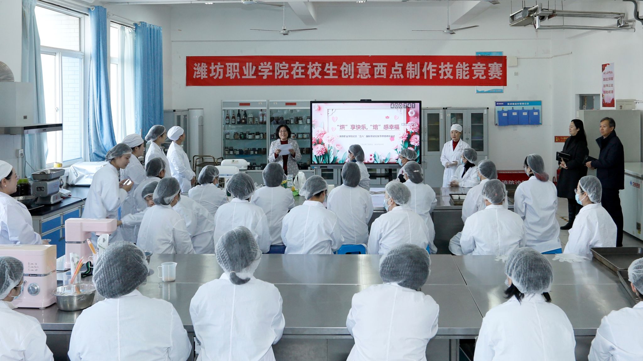 烘焙体验环节中,食品技术专业教师围绕戚风蛋糕制作,系统讲解原料配比、搅拌技巧、烘烤温度与时间控制等专业要点,手把手示范关键操作流程。女教职工们分组协作、动手实践,从蛋黄糊调制、蛋白霜打发,到面糊混合、入模烘烤,全程认真专注、默契配合。在专业教师悉心指导下,大家化身“甜点大师”,在动手实践中感受烘焙乐趣,用行动诠释“劳动创造幸福”的职教理念。活动现场香气四溢、欢声笑语不断,充分展现出学院女教职工昂扬向上、乐享生活的精神风貌。